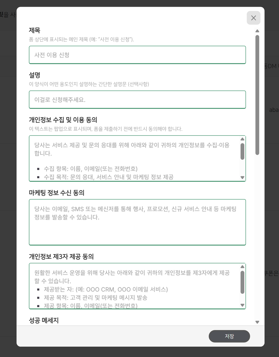 동의 항목 등록: 마케팅 활용을 위한 필수 동의 내용을 추가하세요. (기본 템플릿이 제공되어 수정 후 바로 사용 가능합니다.)